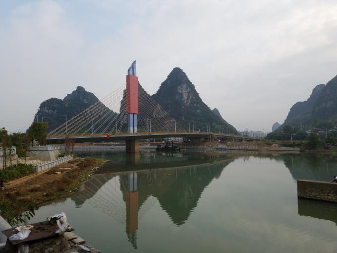 賀州市靈峰大橋工程位于八步區賀江一橋下游0.9公里處,北岸接靈峰北路,是連接賀江兩岸、緩解城市交通壓力、方便居民的重要通道之一。靈峰大橋設計全長為465.018米,其中南引道長50.448米,北引道長80.570米,引道全長131.018米,橋梁長度為334米,橋面寬度27米,按雙向四車道設計。主橋采用獨塔單索面預應力混凝土展翅箱梁斜拉橋,邊跨跨徑68米,主跨跨徑86米,全長154米。橋面以上塔高51米,全橋設計共有77根樁基、9個承臺、7個墩身、2個橋臺。