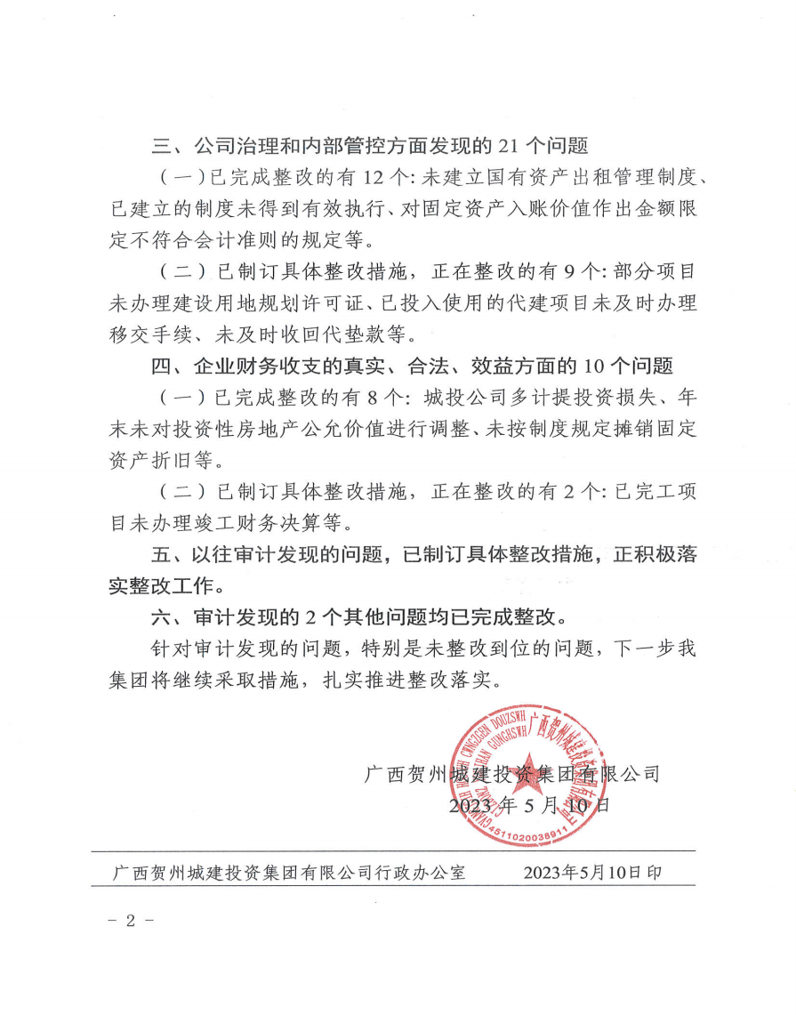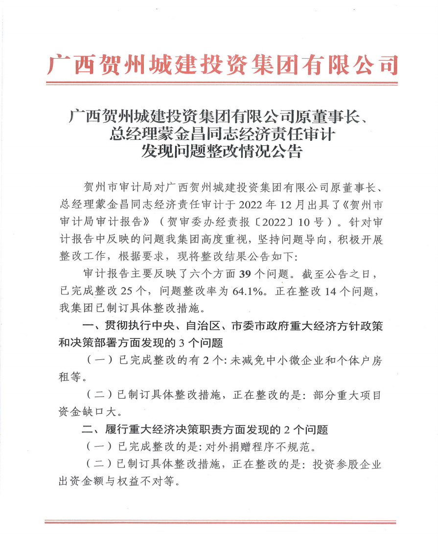 賀州城投集團原董事長、總經理蒙金昌同志經濟責任審計發現問題整改情況公告