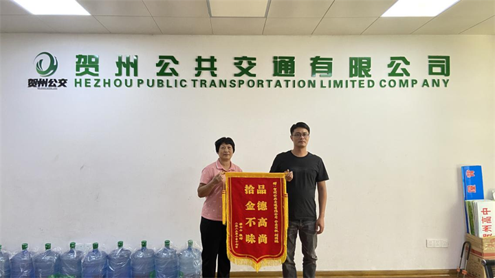 “10月14日,16路駕駛員劉永標(biāo)同志在車上拾得一枚黑色錢包,內(nèi)有現(xiàn)金和證件,隨后公交公司調(diào)度中心工作人員與失主取得聯(lián)系,經(jīng)確認(rèn)信息無(wú)誤后,失主已在當(dāng)天前往調(diào)度中心認(rèn)領(lǐng)。”“10月14日,5路線駕駛員劉國(guó)鵬同志在車上拾得一個(gè)藍(lán)色電話手表,并向公交公司調(diào)度中心報(bào)備。隨后失主梁女士致電調(diào)度中心尋找,經(jīng)確認(rèn)信息無(wú)誤后告知其駕駛員即將電話手表交由調(diào)度中心妥善保管,可到賀州公交公司調(diào)度中心認(rèn)領(lǐng)。10月17日下午,梁女士為劉國(guó)鵬同志送上“拾金不昧,品德高尚”的錦旗,以表示感謝。”