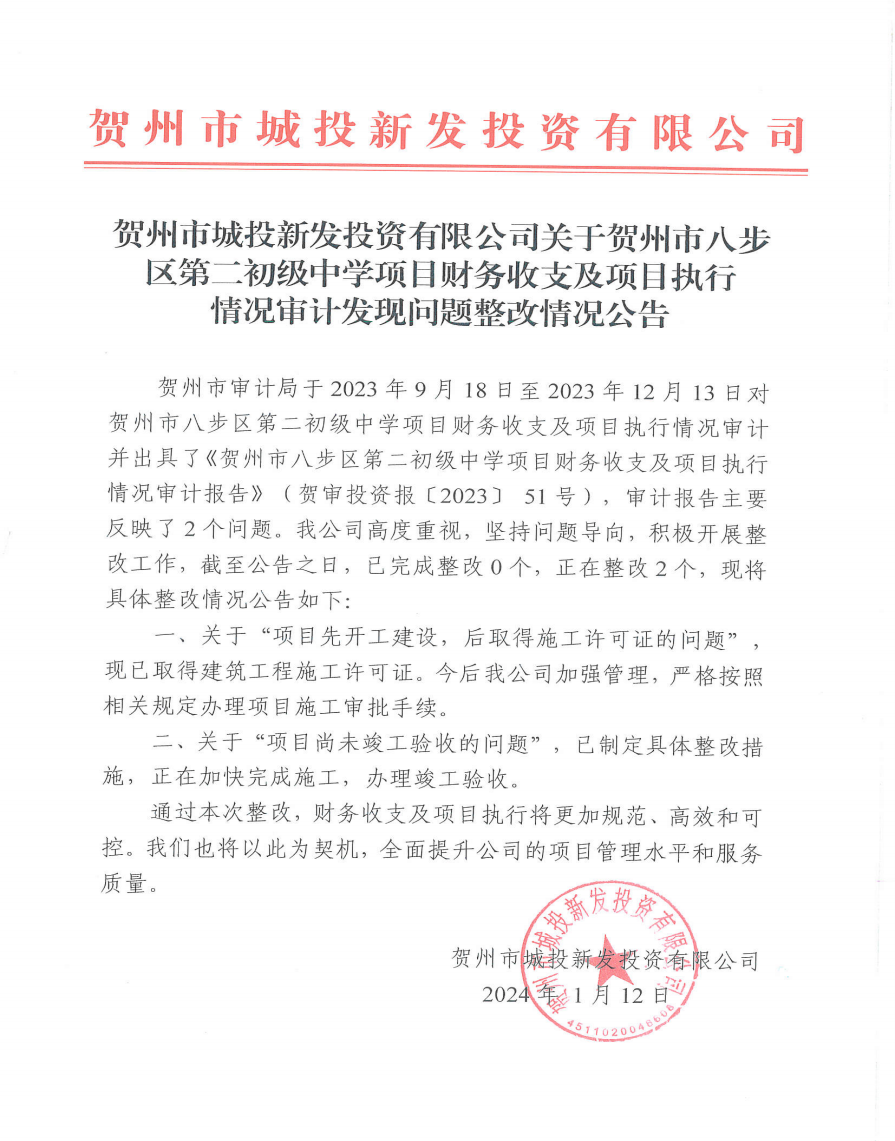 下一篇:廣西賀州城建投資集團有限公司2022年度財務收支情況審計整改情況公告