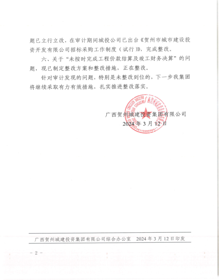 賀州市城市品質提升改造工程財務收支及項目執行情況審計整改情況公告