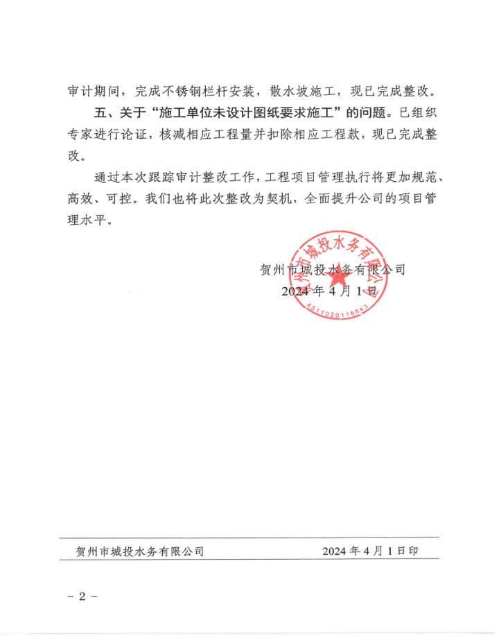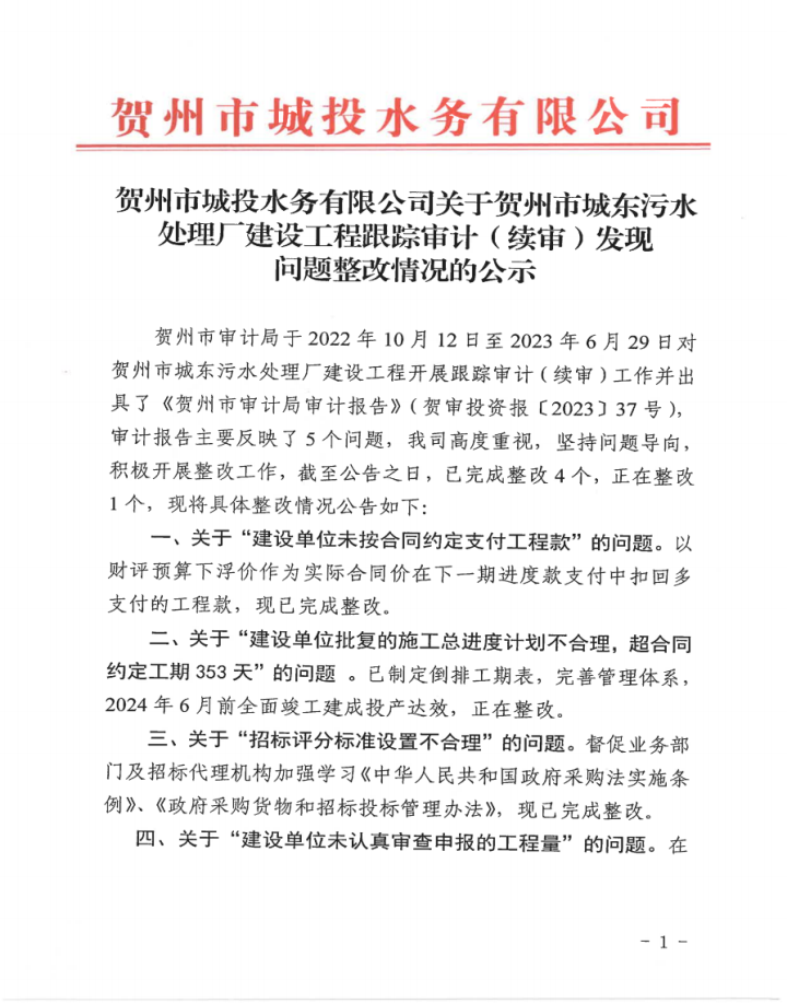 賀州市城投水務有限公司關于賀州市城東污水處理廠建設工程跟蹤審計