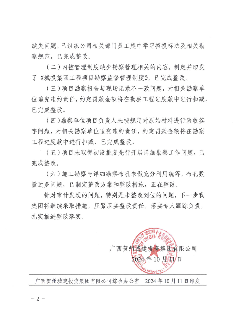 廣西賀州城建投資集團(tuán)有限公司關(guān)于審計(jì)整改結(jié)果情況的公告