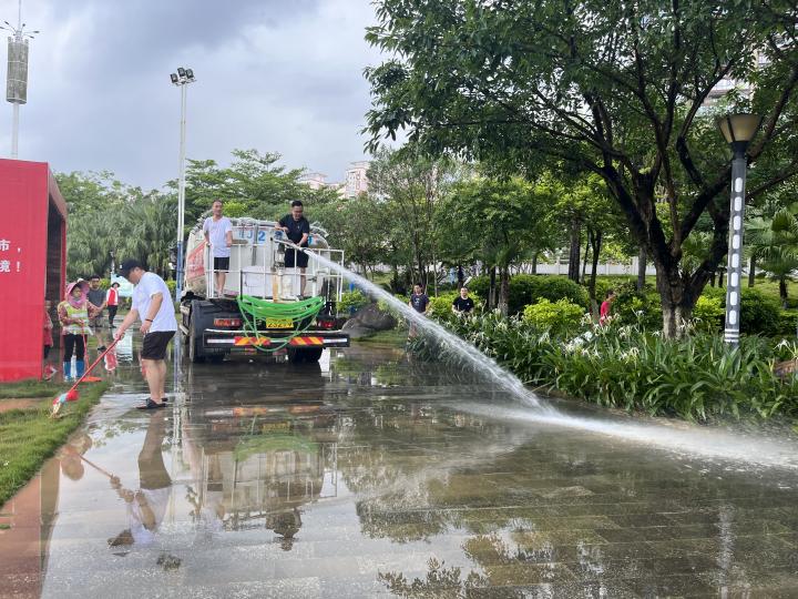 本次清理行動(dòng)分兩組進(jìn)行,一是加大路面保潔作業(yè)力度,對(duì)散落的樹枝、落葉及洪水?dāng)y帶上來的雜物進(jìn)行清理。二是人機(jī)結(jié)合,采取“沖洗+洗掃”聯(lián)合作業(yè)方式,對(duì)林蔭小道路面、公園廣場(chǎng)等地進(jìn)行深度沖洗,徹底消除洪水沉積淤泥。